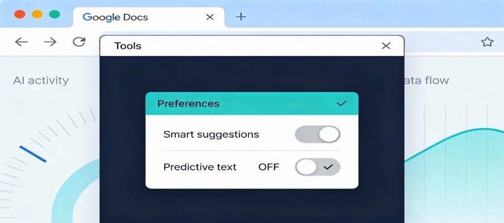 Turn off Docs smart features: In an open document, go to Tools → Preferences and disable smart suggestions such as Smart Compose or similar AI-powered options where available. This limits how much live document content is routed through predictive systems.